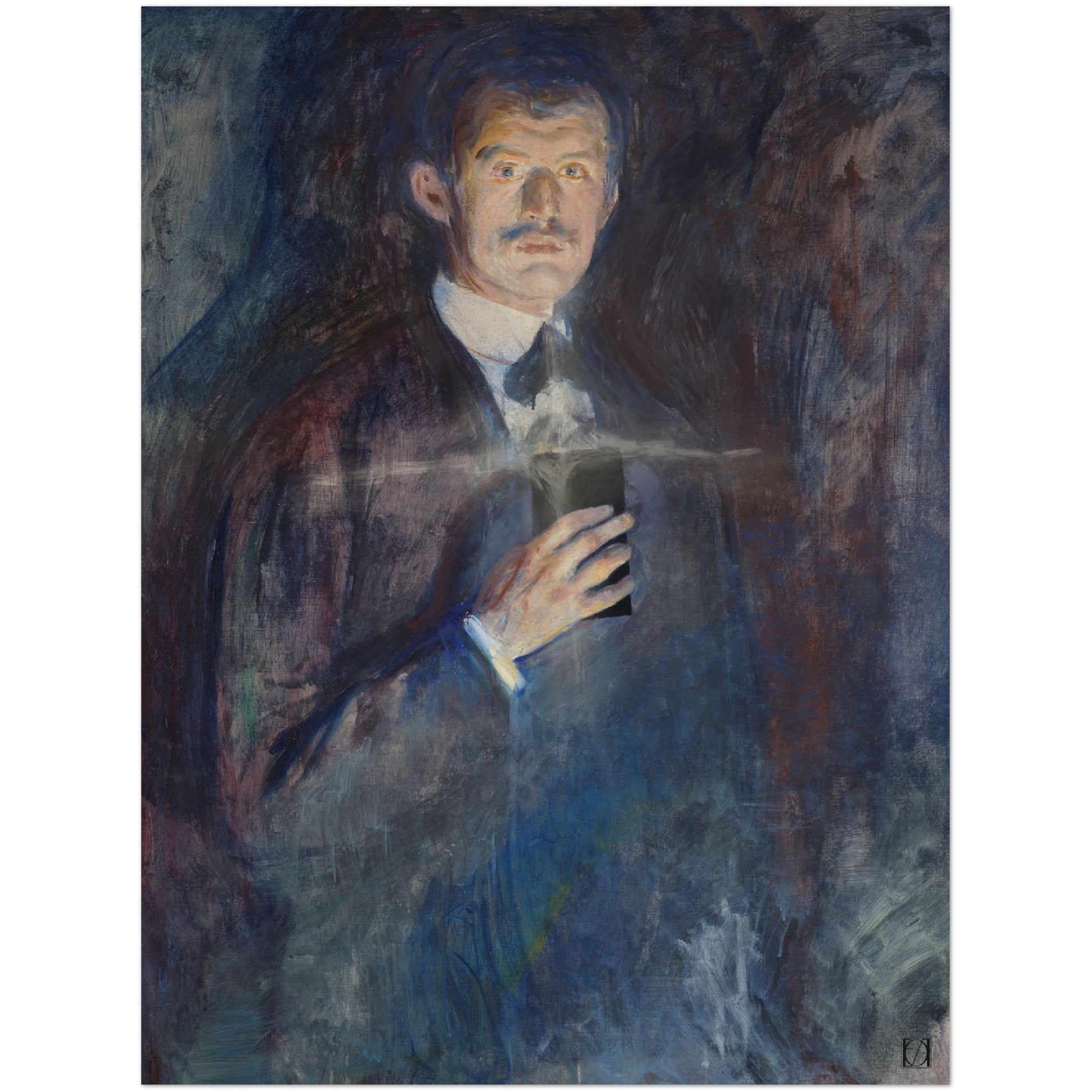 Originalmaleriet som danner grunnlaget for denne plakaten er eit sjølvportrett av Munch, men med ein moderne vri - ein mobiltelefon som ikke fantes på hans tid. Kunstnerar i dag ville likevel vært enig i at dersom kuntsnarar hadde hatt mobil på den tida, ville dei også ha brukt den flittig!
