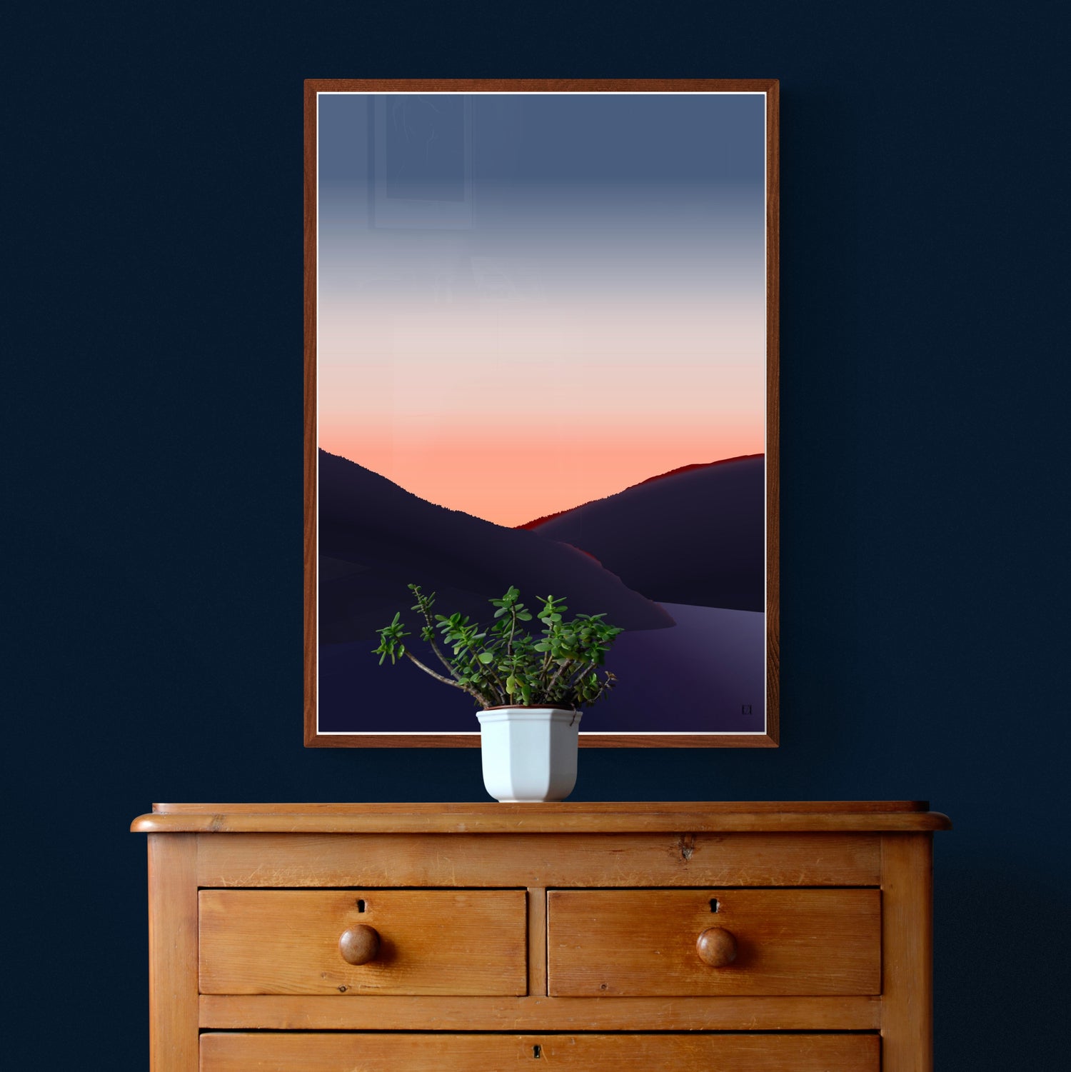Soloppgang over Sogn kjem i 5 forskjellige format. Dei kvadratiske i 50x50cm og 70x70cm og dei standardiserte måla påp 30x40, 50x70 og 70x100 cm. Soloppgang over Sogn vil gjere seg godt i kvar ei ramme og kanskje spesielt godt på ein mørkmåla vegg.