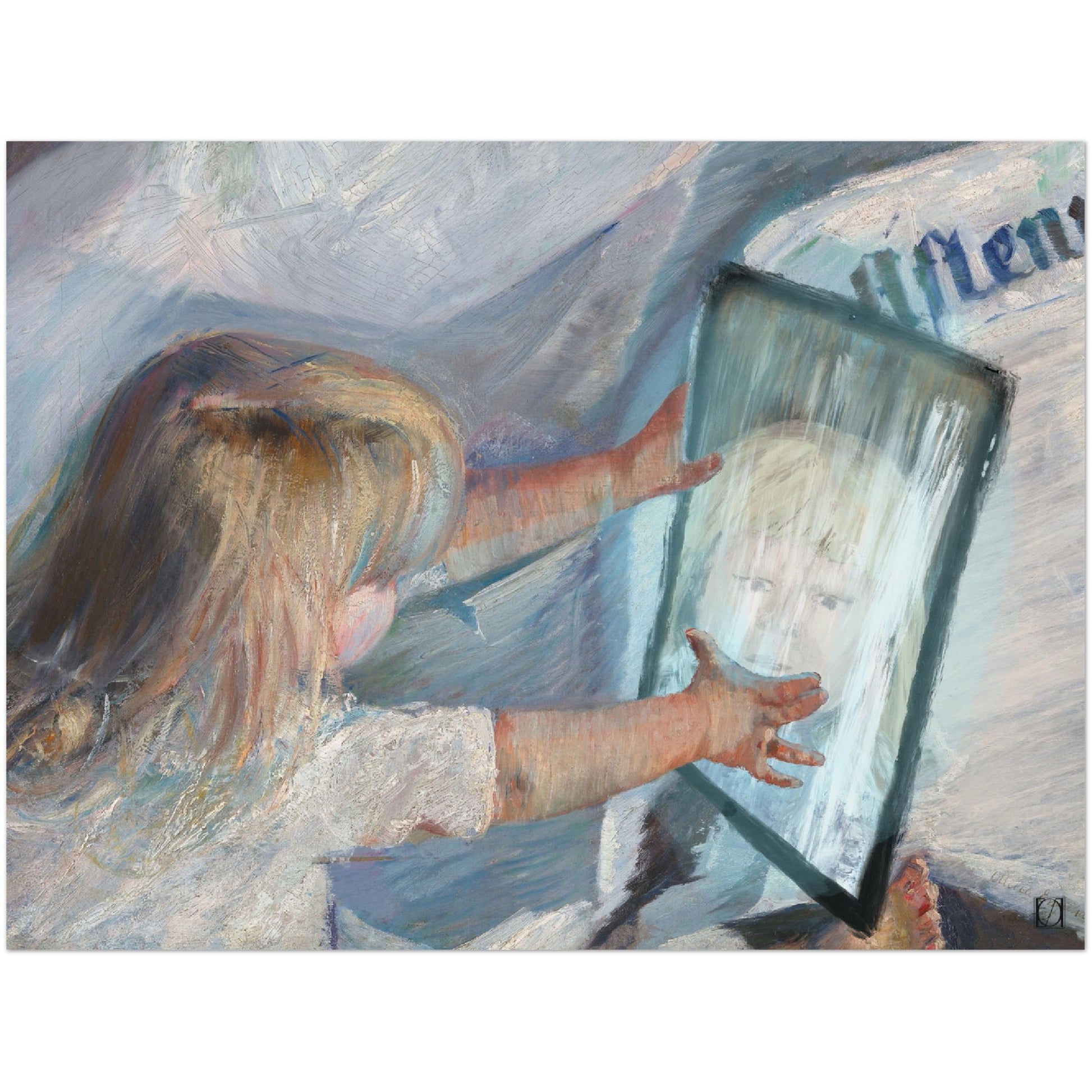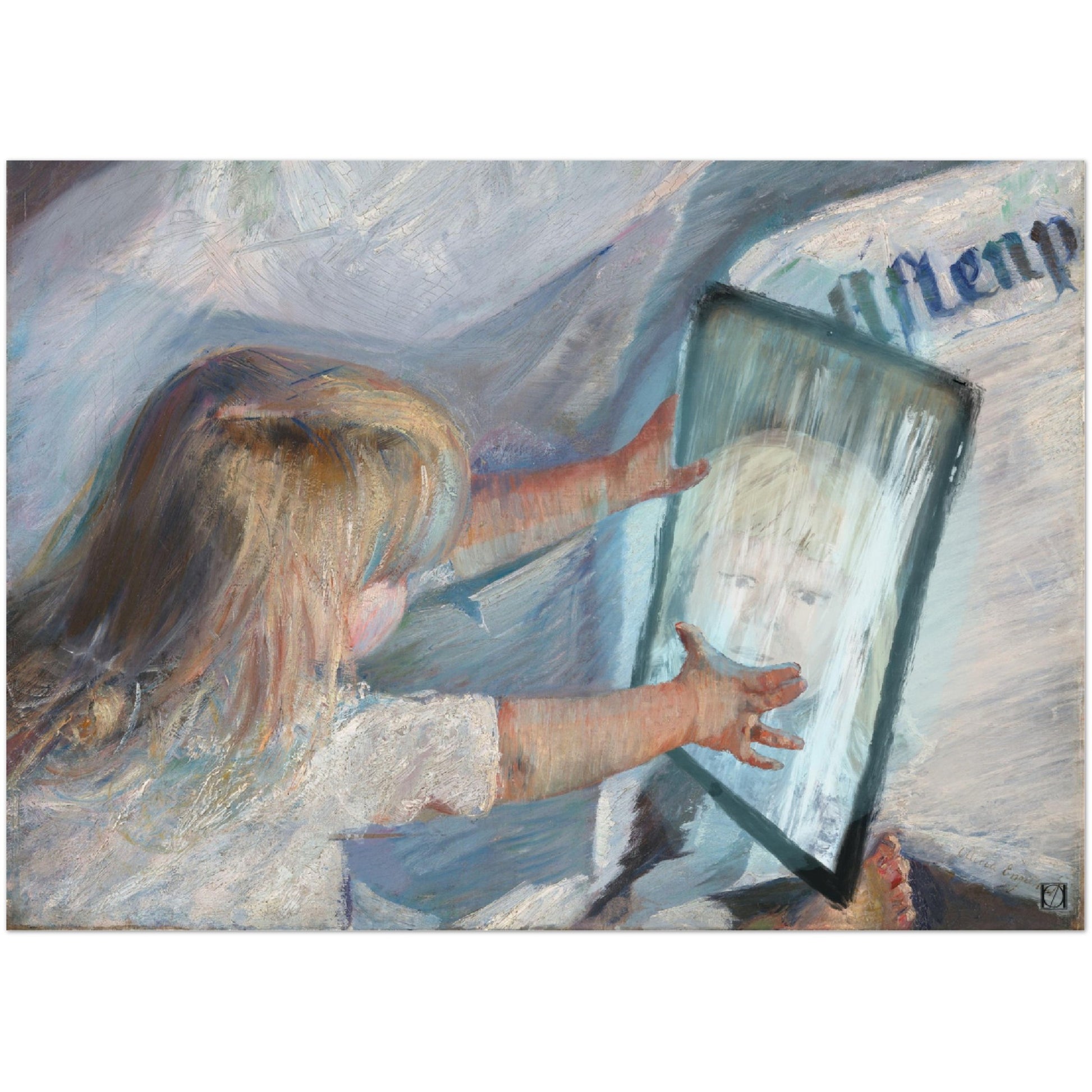 Det klassiske måleriet som er brukt på denne t-skjorta er En abonnent på aftenposten, av Oda Krogh. I originalen klypper bornet avisa med saks, og det kan virke som om det uttrykkjer uro eller misnøye med avisa. Som lærar skulle eg ønskje eg kunne la elevane mine klippe og leike med avisene, og være kreative. Men dessverre er det ofte slik i dag at borna er fanga av nettbrettet sitt og kjedsomhet er meir sjeldan. Detta gir mindre rom for kreativ skaping og destruksjon. Ipaden er den enkle løysinga for ein mor eller far for å få vere i fred til lese (nett)avisene sine, men er det den beste løysinga?