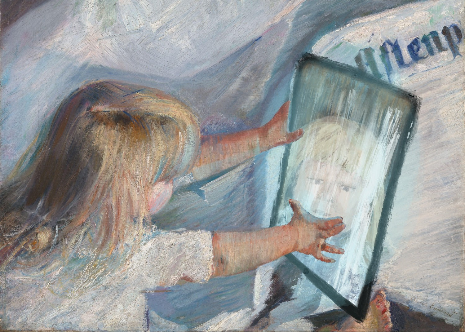 Det klassiske måleriet som er brukt på denne t-skjorta er En abonnent på aftenposten, av Oda Krogh. I originalen klypper bornet avisa med saks, og det kan virke som om det uttrykkjer uro eller misnøye med avisa. Som lærar skulle eg ønskje eg kunne la elevane mine klippe og leike med avisene, og være kreative. Men dessverre er det ofte slik i dag at borna er fanga av nettbrettet sitt og kjedsomhet er meir sjeldan. Detta gir mindre rom for kreativ skaping og destruksjon. Ipaden er den enkle løysinga for ein mor eller far for å få vere i fred til lese (nett)avisene sine, men er det den beste løysinga?